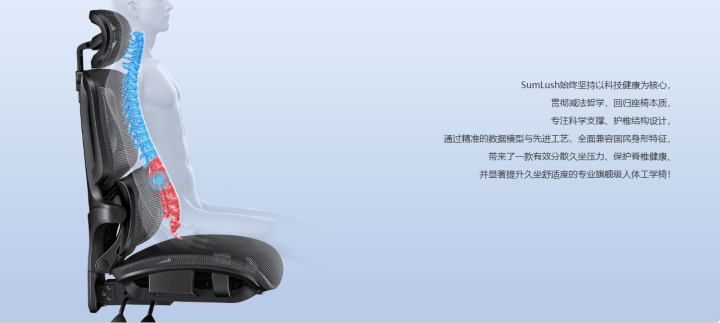 体验之前,我们先来了解了解Sumlush夏草木这个品牌。她可不是普通办公椅品牌,而是基于科学久坐舒适理念,围绕坐姿健康、脊椎保护与智能联动支撑进行深度研究,以行业旗舰级标准打造人体工学椅的品牌。其核心科技创新是搭载ZeroG灵动腰靠系统、S-Flex多维脊椎分压技术、MTM悬浮式微调支撑模组等多项领先技术,实现撑-托-护腰一步到位。SumLush夏草本实现人体工程学定制,结合全球200多位设计师、It从业员、电竞选手及专业人士的深度测试与优化,真正满足不同体型、坐姿习惯和使用场景的需求。